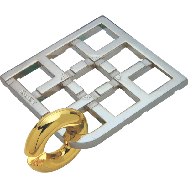 Das Metall-Puzzle muß auseinandergenommen und wieder zusammengesetzt werden. Die Sternchen (* - ******) kennzeichnen den Schwierigkeitsgrad.
